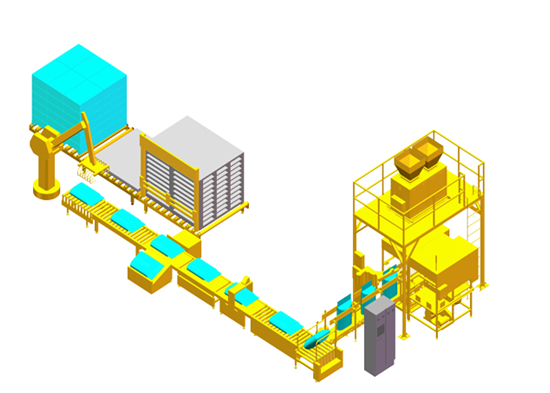 經(jīng)前面工序檢測合格的產(chǎn)品被輸送至碼垛輸送機(jī),由碼垛機(jī)器人按設(shè)定好的碼垛方式自動包裝袋搬運(yùn)到托板上,達(dá)到取代人工搬運(yùn)、節(jié)約成本、提高勞動效益的目的。