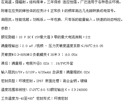 據(jù)資料,該低溫型脈動壓力傳感器屬于電阻應變式壓力傳感器。傳感器采用離子束濺射薄膜技術,在金屬膜片上直接生成電介質隔離膜和功能材料電阻膜(薄膜應變電阻),在電阻膜上制作應變電阻,組成惠斯通電橋。當被測介質的壓力發(fā)生變化時,應變電阻阻值也隨之變化,從而使傳感器輸出電壓值發(fā)生變化。傳感器金屬膜片上還制備了一個測溫電阻,通過測溫電阻,當傳感器的工作環(huán)境溫度發(fā)生變化時,測溫電阻阻值也隨之變化,并提供給變換器,通過變換器獲取工作環(huán)境溫度。低溫型脈動壓力傳感器系統(tǒng)具有使用測量低溫區(qū)寬的特點,傳感器使用溫度范圍為-253℃~ 60℃(液氫溫度);測量范圍:(0~60))MPa。
