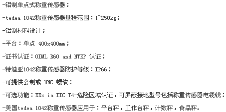 1042是鋁制單點式稱重傳感器,防護等級IP 66,支撐臺面:400X400mm,廣泛應(yīng)用于平臺秤,工作臺秤,計數(shù)秤,食品秤等多個領(lǐng)域。(1042 of aluminum single point weighing sensor, protection class IP 66, supporting the table: 400 x400mm, widely applied to the platform scale, work platform scales, counting scales, food scales and other fields.)
