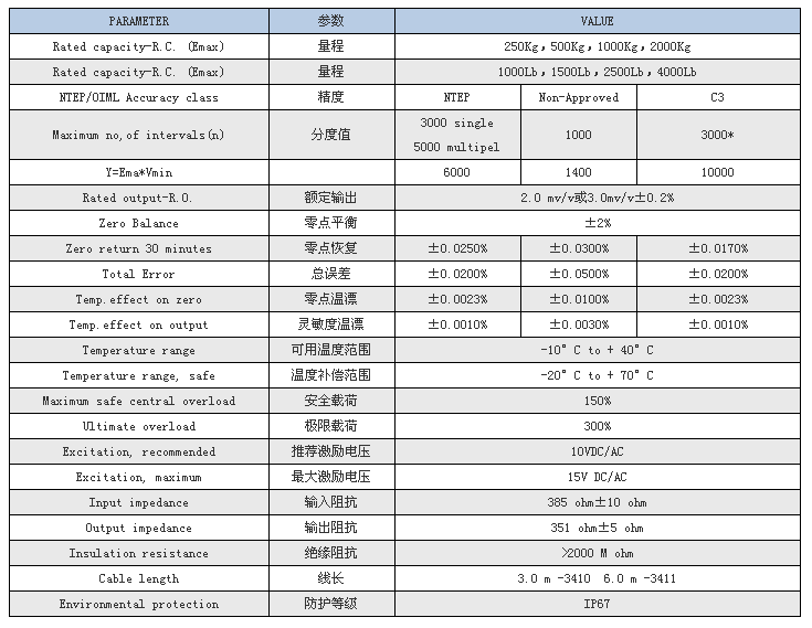 特迪亞3410-250KG稱重傳感器產(chǎn)品參數(shù)表: