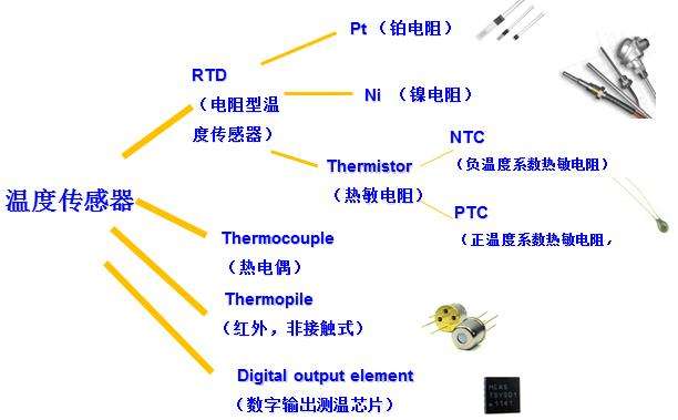 溫度傳感器按照傳感器材料及電子元件特性分為熱電阻和熱電偶兩類。