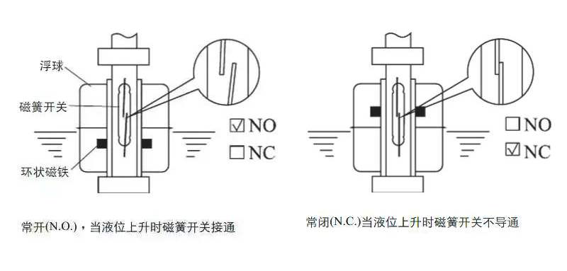 動開關(guān)或脫離微動開關(guān),使液位開關(guān)ON或OFF的接點(diǎn)信號輸出。