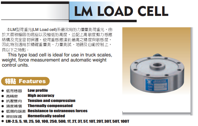 本LM型荷重元(LM Load cell)係最常用的力量量測荷重元,由於大面積穩(wěn)固的底座以及極低的高度,並配上高敏度剪力彈力結(jié)構(gòu)及完全密封保護(hù),使荷重感應(yīng)達(dá)到最高之精度與敏感度,因此特別適用於精確重量測、力量測試、地磅及自動(dòng)控制上,具以下之特點(diǎn):