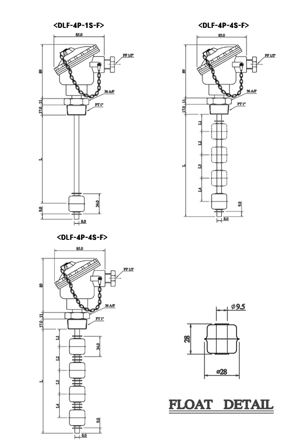 DLF是控制體積小坦克迷你浮球液位開關(guān),在傳感器簧片開關(guān)操作為浮子上下移動,其中安裝了一個永久磁鐵,這是一個使用通/斷信號從中繼級別開關(guān)。DLF - 4P(點(diǎn))- 4S(STS)- GH(插座及缸蓋)是控制4 4花車每個接觸點(diǎn)液位開關(guān)。根據(jù)用戶的選擇,它可以產(chǎn)生輸出最多4個觸點(diǎn)信號。