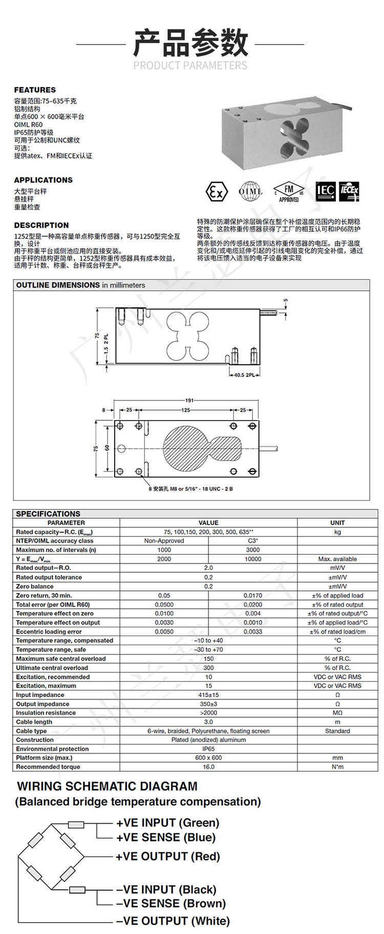 美國(guó)Tedea 1252稱重傳感器產(chǎn)品參數(shù):