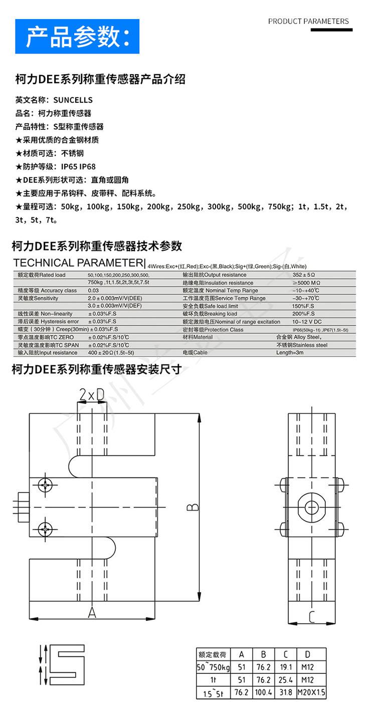 寧波柯力 DEE-1T稱重傳感器產(chǎn)品參數(shù):