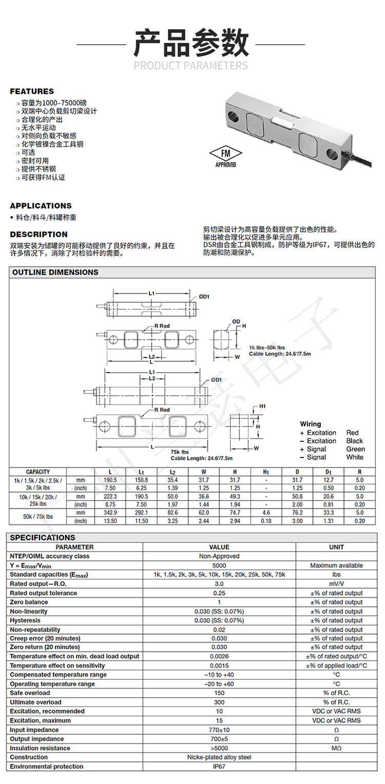 量程:1K, 1.5K, 2K, 2.5K, 3K, 5K, 10K, 15K, 20K, 25K, 50K, 75K lb