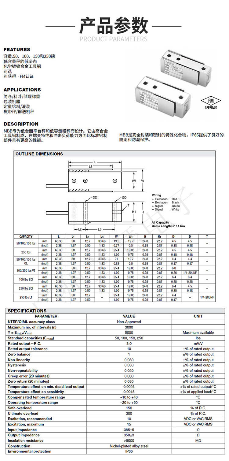 美國Celtron MBB-75kg稱重傳感器產品參數(shù):