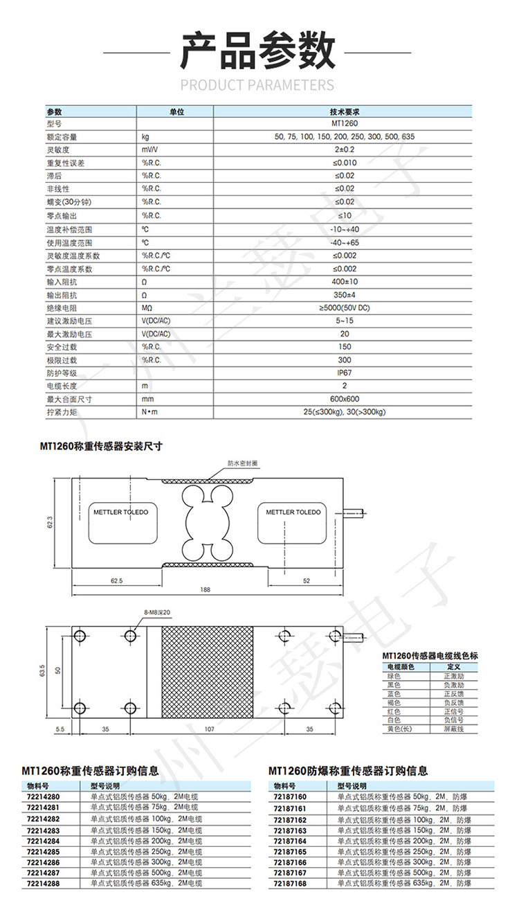 注:MT1260-50 是梅特勒-托利多傳感器中容量為50kg,那么型號就是MT1260-50。以止類推得到MT1260系列的所有型號。