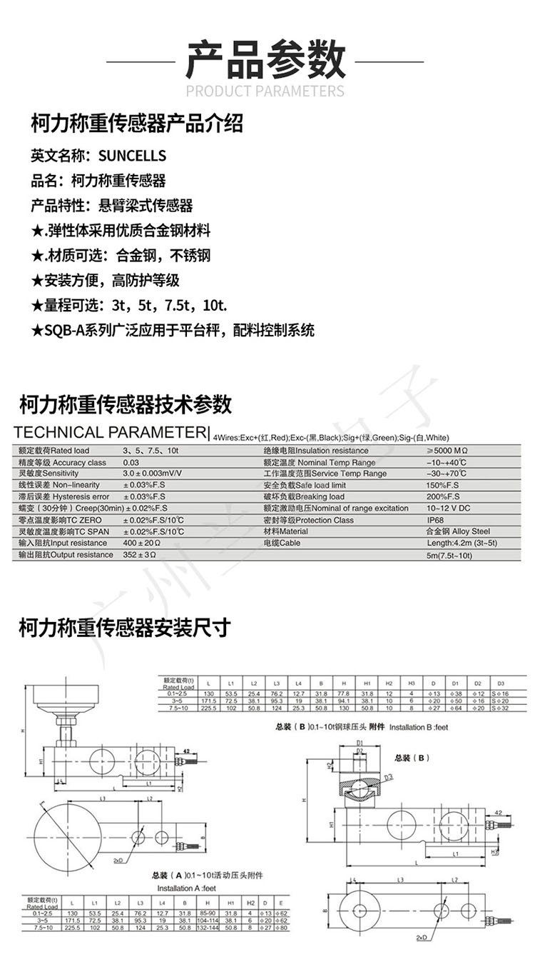 柯力SQB稱重傳感器主要參數: