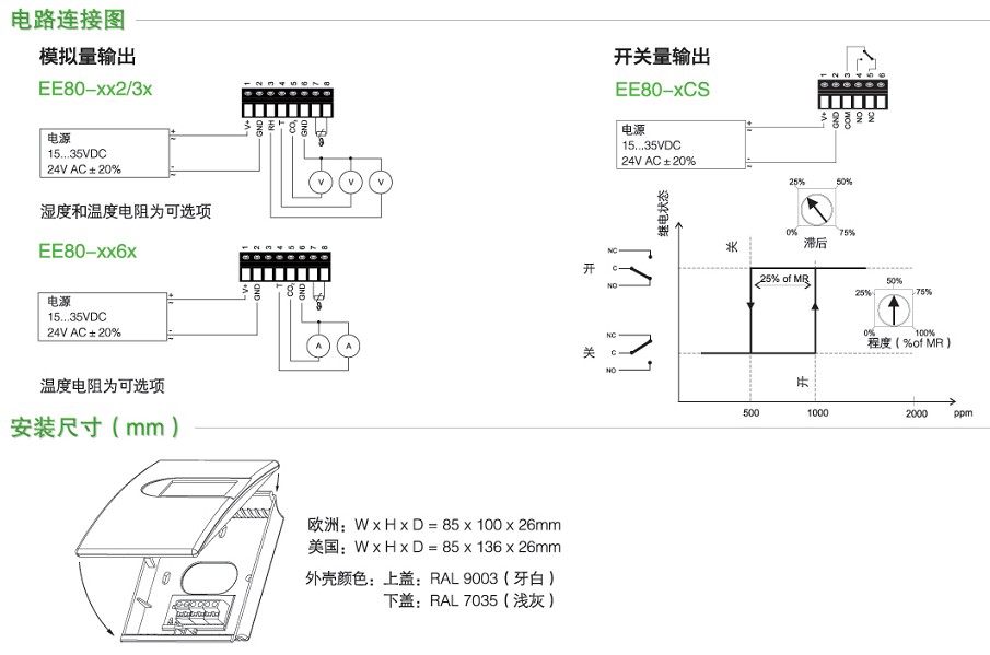 儀表外形設(shè)計(jì)美觀、安裝簡便,CO2輸出信號(hào)為標(biāo)準(zhǔn)的4-20mA或0-5/10V DC信號(hào)。根據(jù)用戶的需求,EE80 還可輸出相對(duì)濕度和溫度信號(hào),并提供可設(shè)定報(bào)警點(diǎn)和回差點(diǎn)的開關(guān)信號(hào)輸出方式。多種的型號(hào)能滿足用戶的不同要求,所有EE80 系列變送器都可以配置清晰的液晶顯示模塊用以現(xiàn)場的參數(shù)顯示。