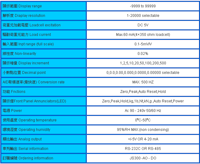 臺(tái)灣JIHSENSE JS-300稱(chēng)重顯示控制器規(guī)格: